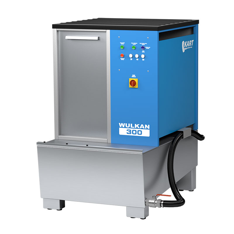 Моечная машина работает в замкнутой циркуляции, благодаря чему для подключения ее нужны лишь сжатый воздух и 380В .