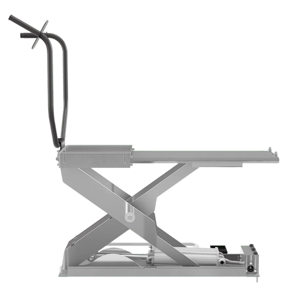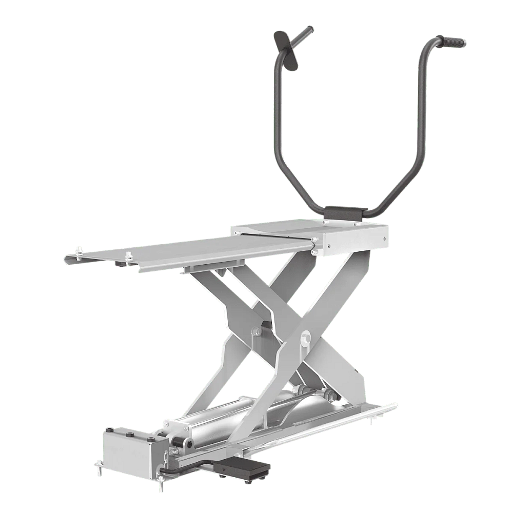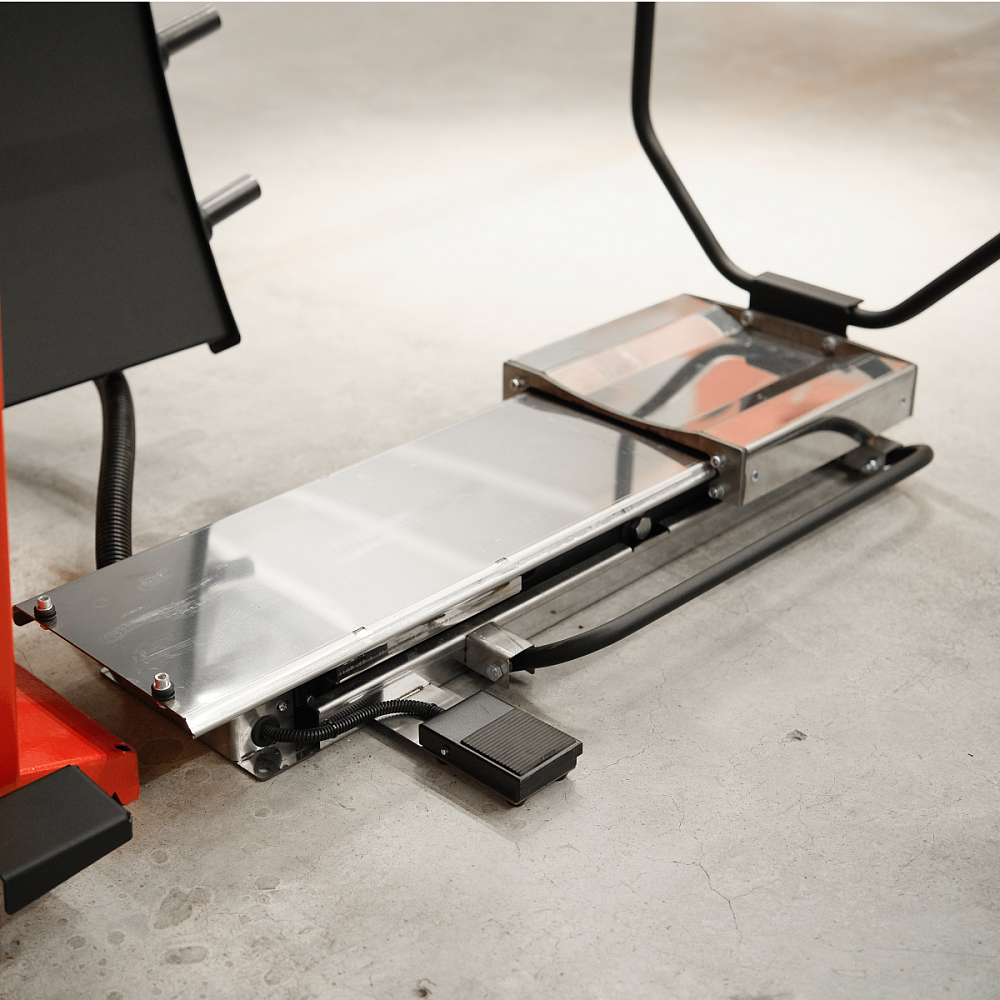 - Нажимаем на педаль, подъемник поднимается до нужной высоты и подхватывает колесо, минимизируя нагрузку на вал.
