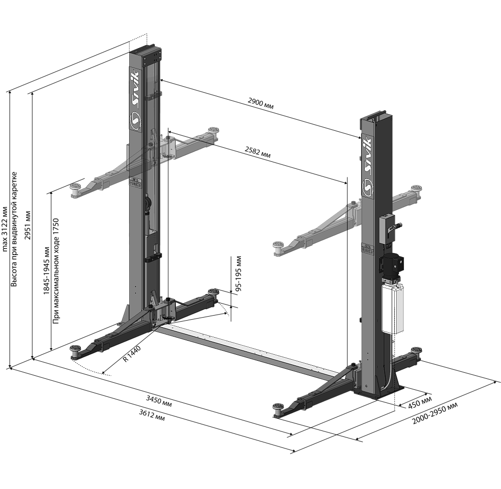 Классическая симметричная конструкция с двухсоставными подхватами низкого профиля позволяет обслуживать машины с низким клиренсом.