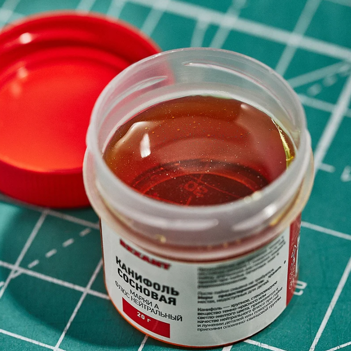 Канифоль представляет собой хрупкое стекловидное вещество от темно-красного до светло-желтого цвета, применяемое в качестве нейтрального флюса при пайке и лужении деталей и поверхностей оловянно-свинцовыми припоями.