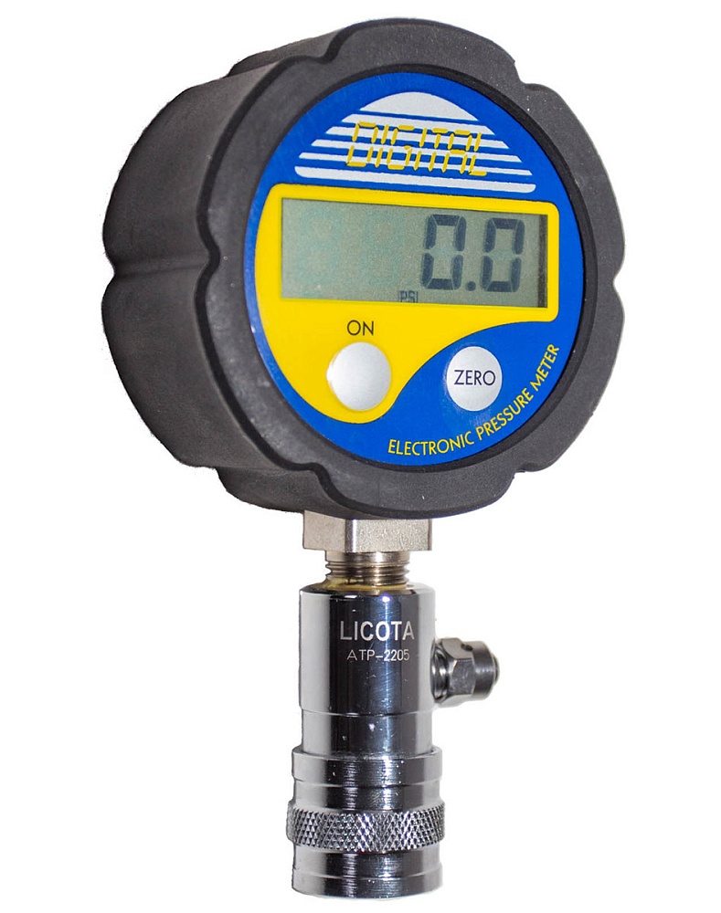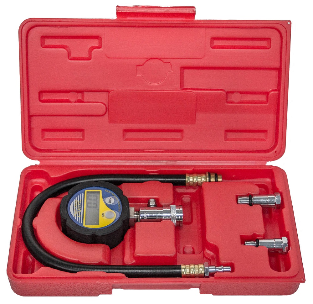 Компрессометр оснащён цифровым манометром с быстрым разъемом и кнопкой сброса показаний, гибким шлангом высокого давления и сменными насадками.