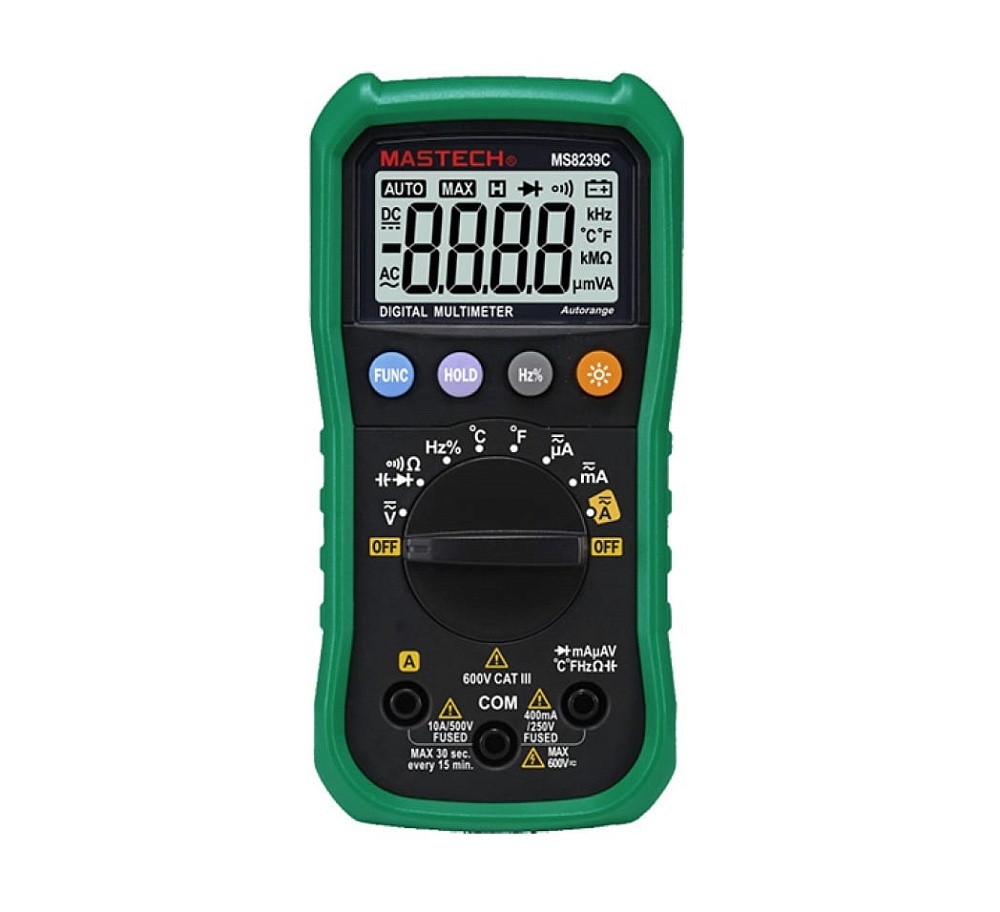 Цифровой мультиметр MAS8239С предназначен для измерения силы тока, постоянного и переменного напряжения, сопротивления, определения направления тока диодов и параметров транзисторов.