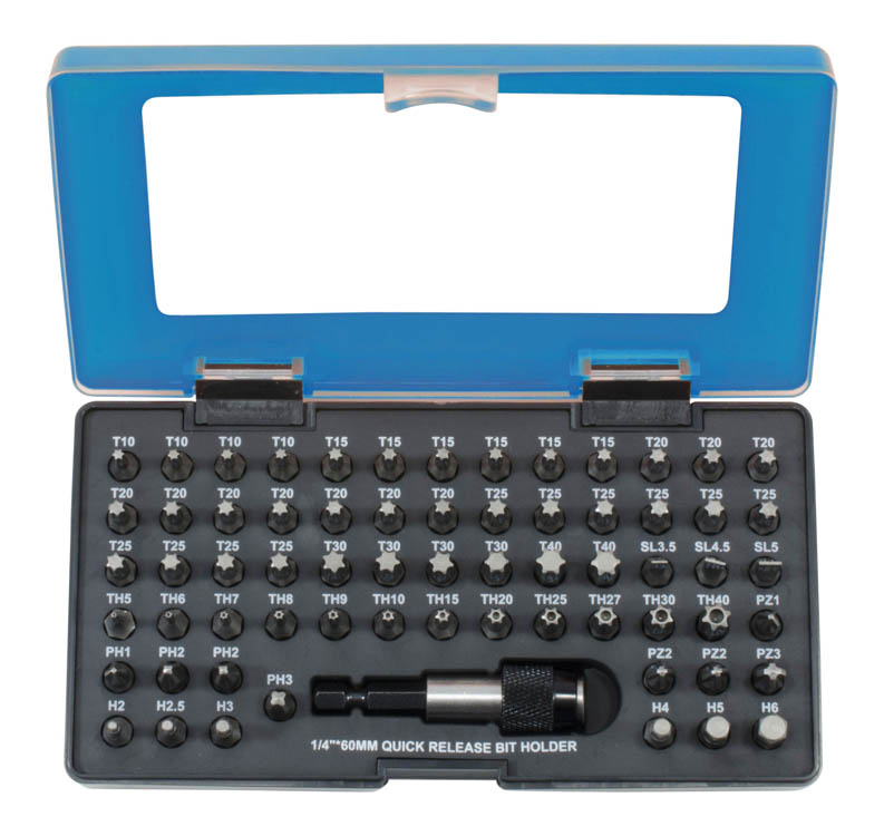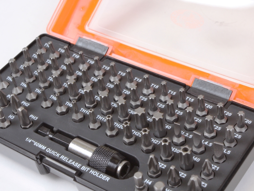 Набор бит из 66 предметов отлично подойдет любителю и профессионалу: полный ряд бит разного профиля упакован в удобный кейс.
