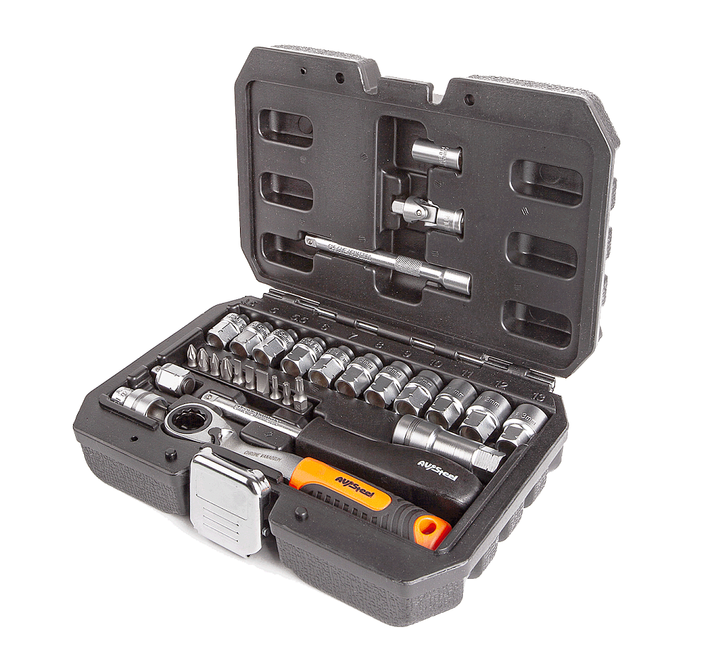 Набор головок торцевых 29 предметов 1/4" 6-гранных ПРОХОДНЫХ, (?-13мм) трещотка, вороток, биты, адапторы, удлинитель
