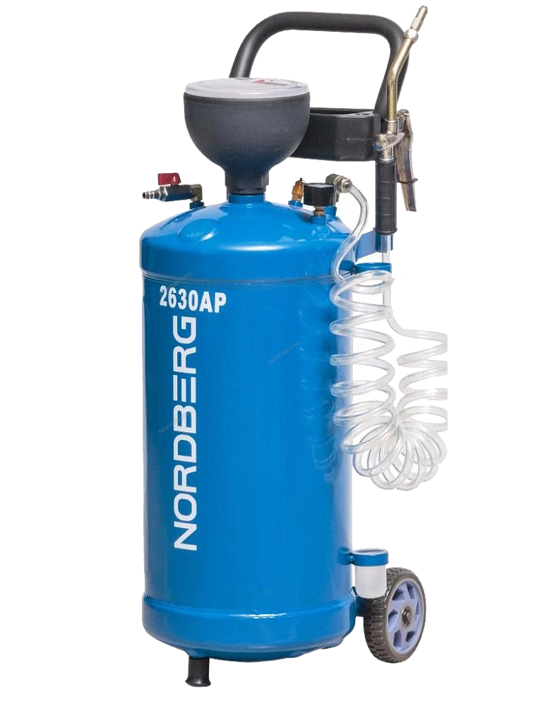 Установка для раздачи масла NORDBERG 2630AP стальная емкость объемом 30 л, на колесах для удобства перемещения в помещении автосервиса, оборудована пластиковой воронкой, через которую необходимое для заправки, масло, заливается в емкость, шлангом с маслораздаточным пистолетом, шаровым краном для подключения внешнего источника воздушного давления (компрессор до 10 Атм - поставляется отдельно) .