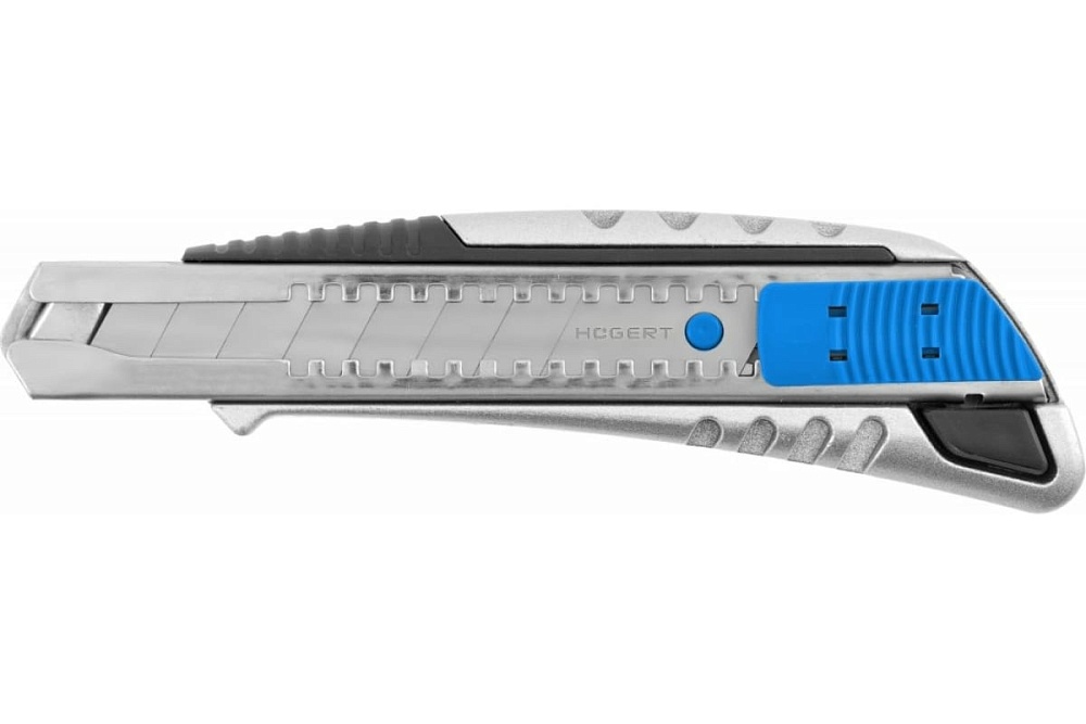 Пластиковый нож HOEGERT TECHNIK с отламывающимся лезвием 18 мм, алюминиевый, с блокировкой HT4C637 полезен для отделочных работ. Особенно подходит для резки картона, обоев, ковролина, брезентовых тканей, печатных и ПВХ пленок и т.д.