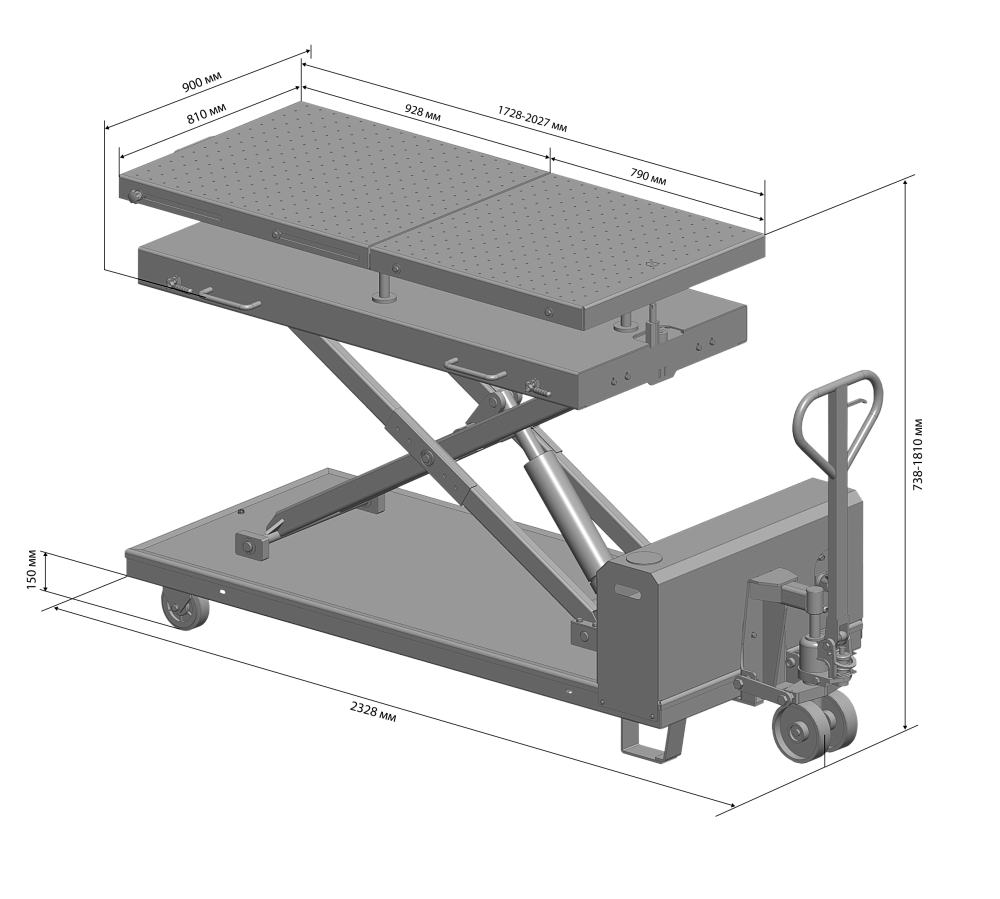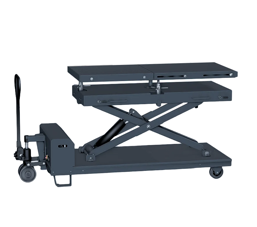 Верхний стол поддерживается нижним столом, который соединен с базовой рамой с помощью ножничной подъемной системы.