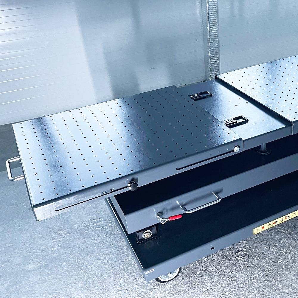 Верхний стол может автоматически наклоняться влево/вправо и вперед/назад с помощью линейного привода, управляемого пультом дистанционного управления . Его можно выдвинуть,отпустив стопорный винт.