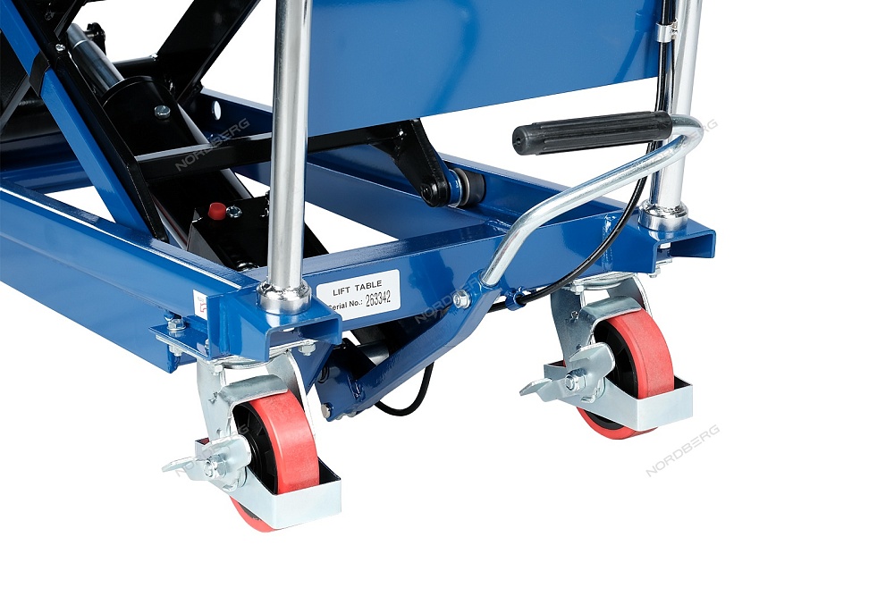 Подъемный стол имеет гидравлический ножной привод, который позволяет произвести быстрый подъем груза.