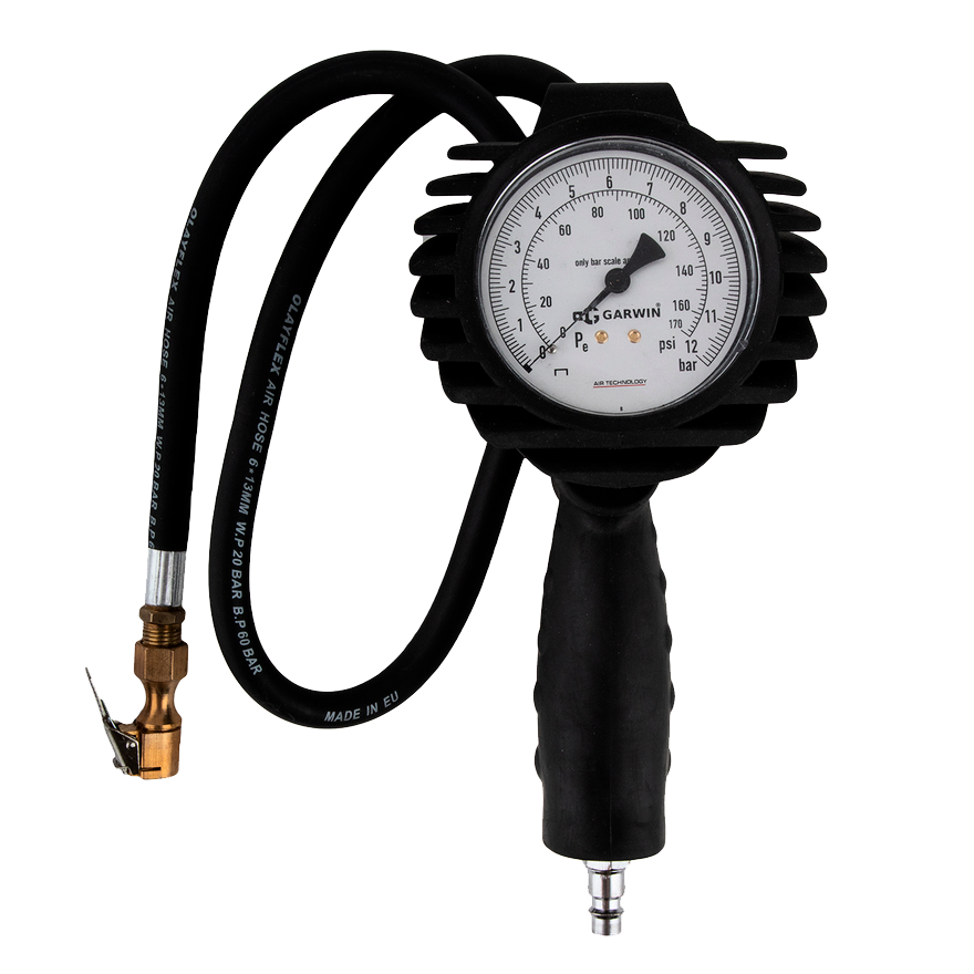 Пистолет для накачки шин GARWIN 806006-01 с универсальной насадкой и механическим манометром для контроля давления.