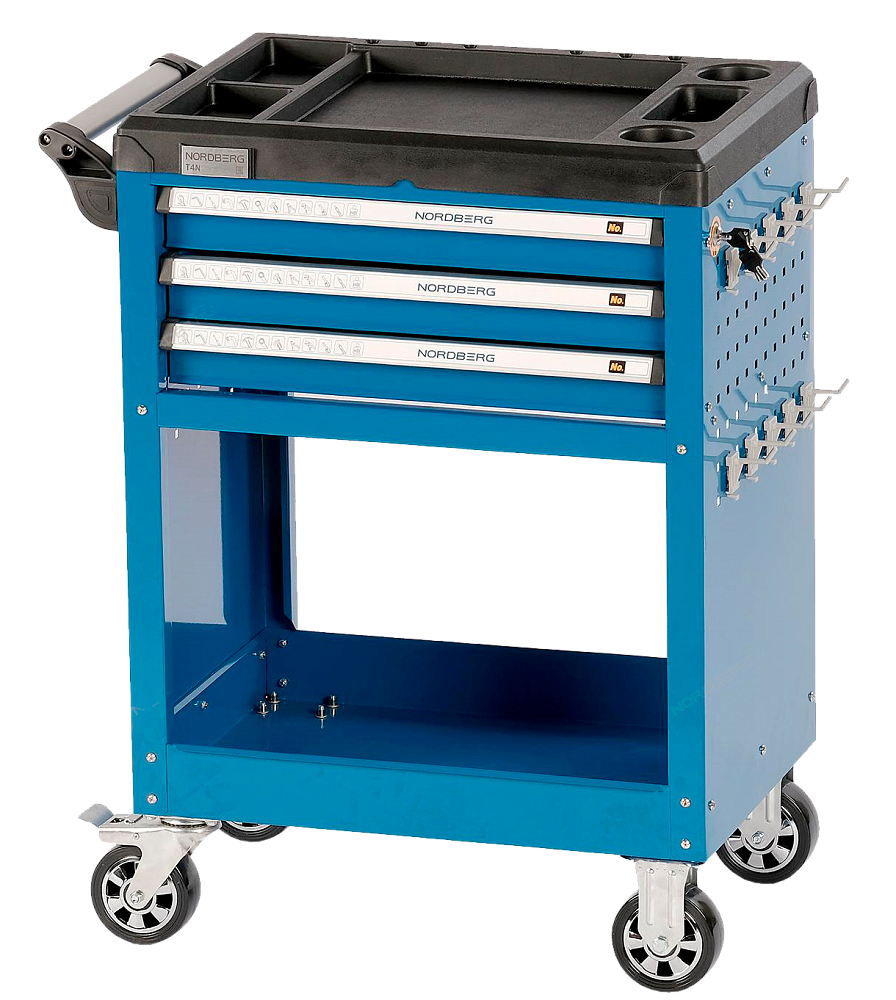 Одна из боковых стенок тележки имеет перфорированную панель, для крепления на ней крючков для инструмента . Крючки идут в комплекте с тележкой.